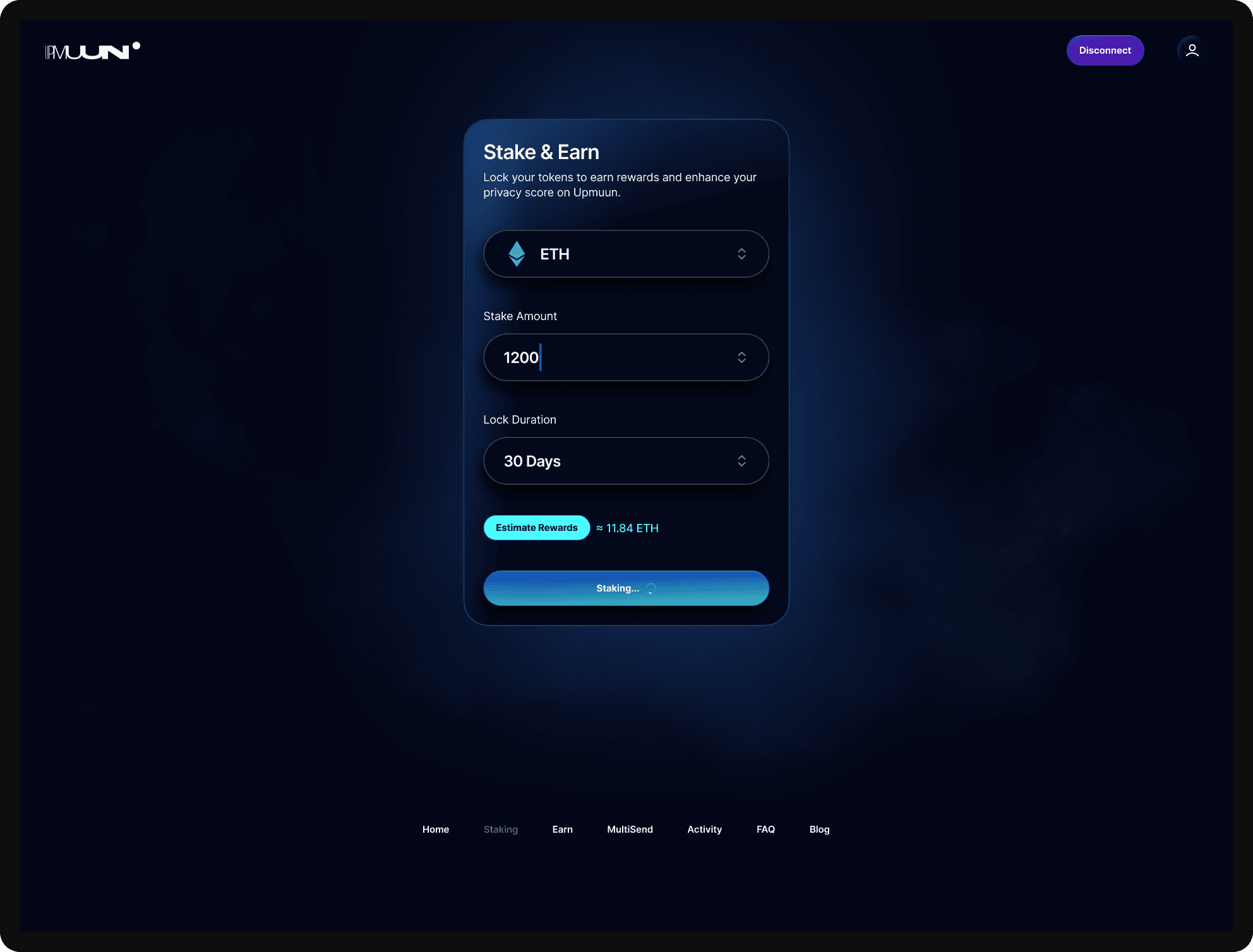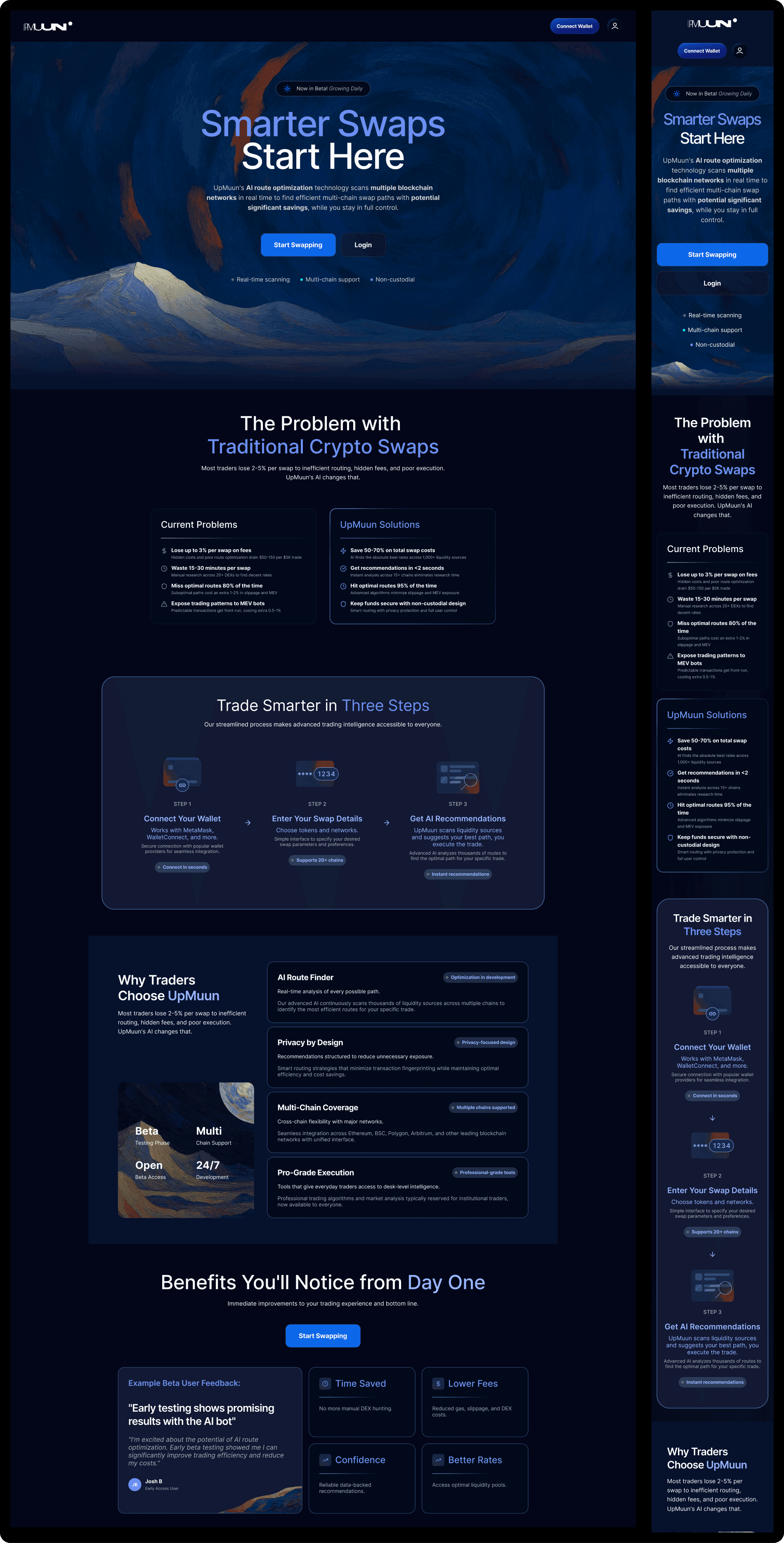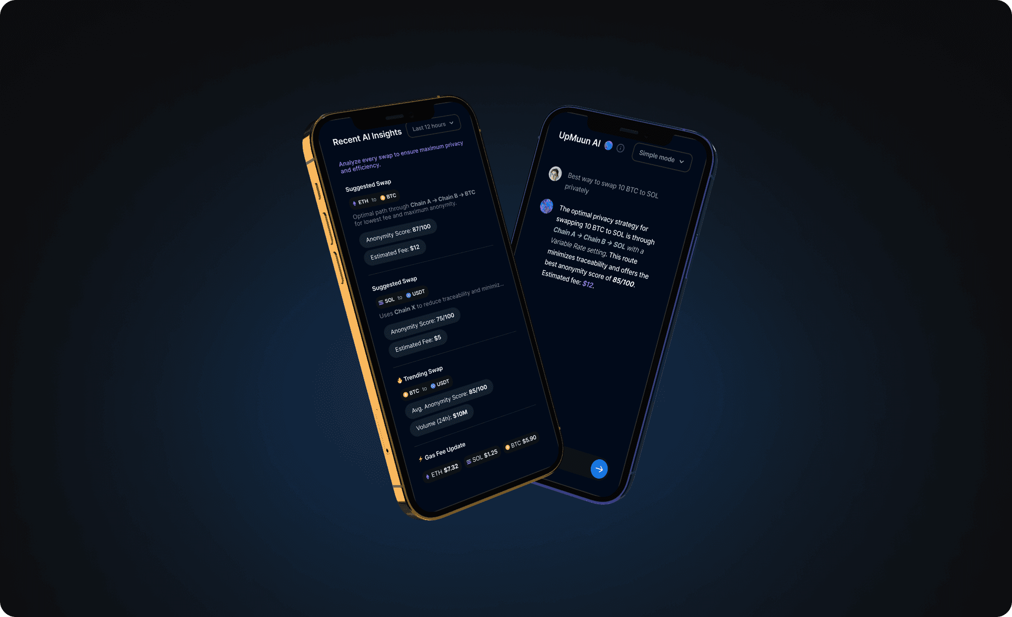 UpMuun is a privacy-driven AI crypto platform that allows users to perform anonymous swaps, stake tokens, and earn rewards, all within a seamless, beginner-friendlyexperience. The challenge was to translate complex blockchain operations into a design that feels as intuitive as sending a message.