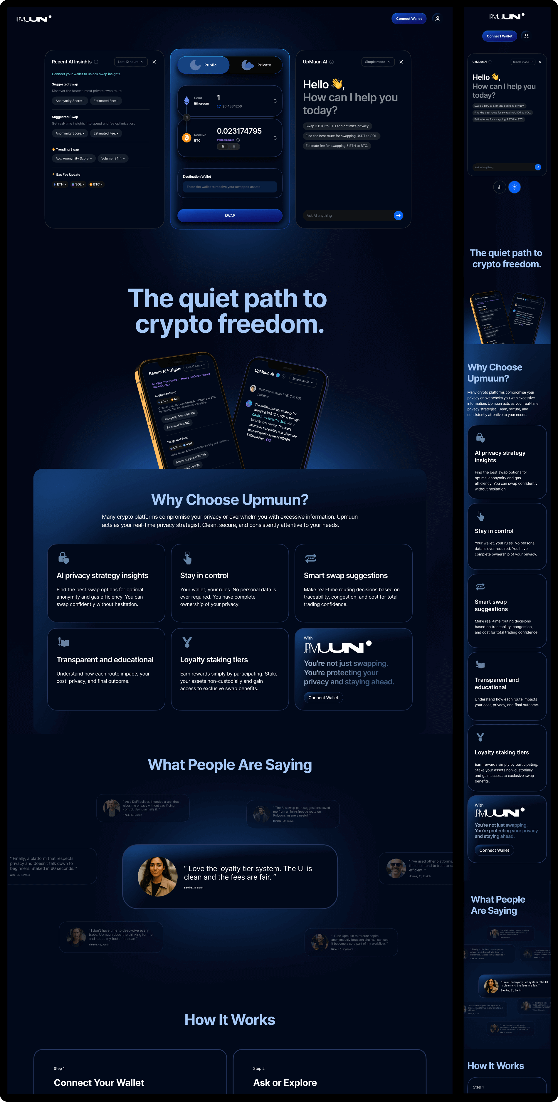 When I set out to design UpMuun, the goal was deceptively simple: create a crypto platform so effortless that anyone could swap, stake, or bridge assets across blockchainswith complete privacy and confidence. In a space filled with cluttered interfaces and intimidating workflows, I wanted UpMuun to feel like the opposite: calm, elegant, andintelligent.