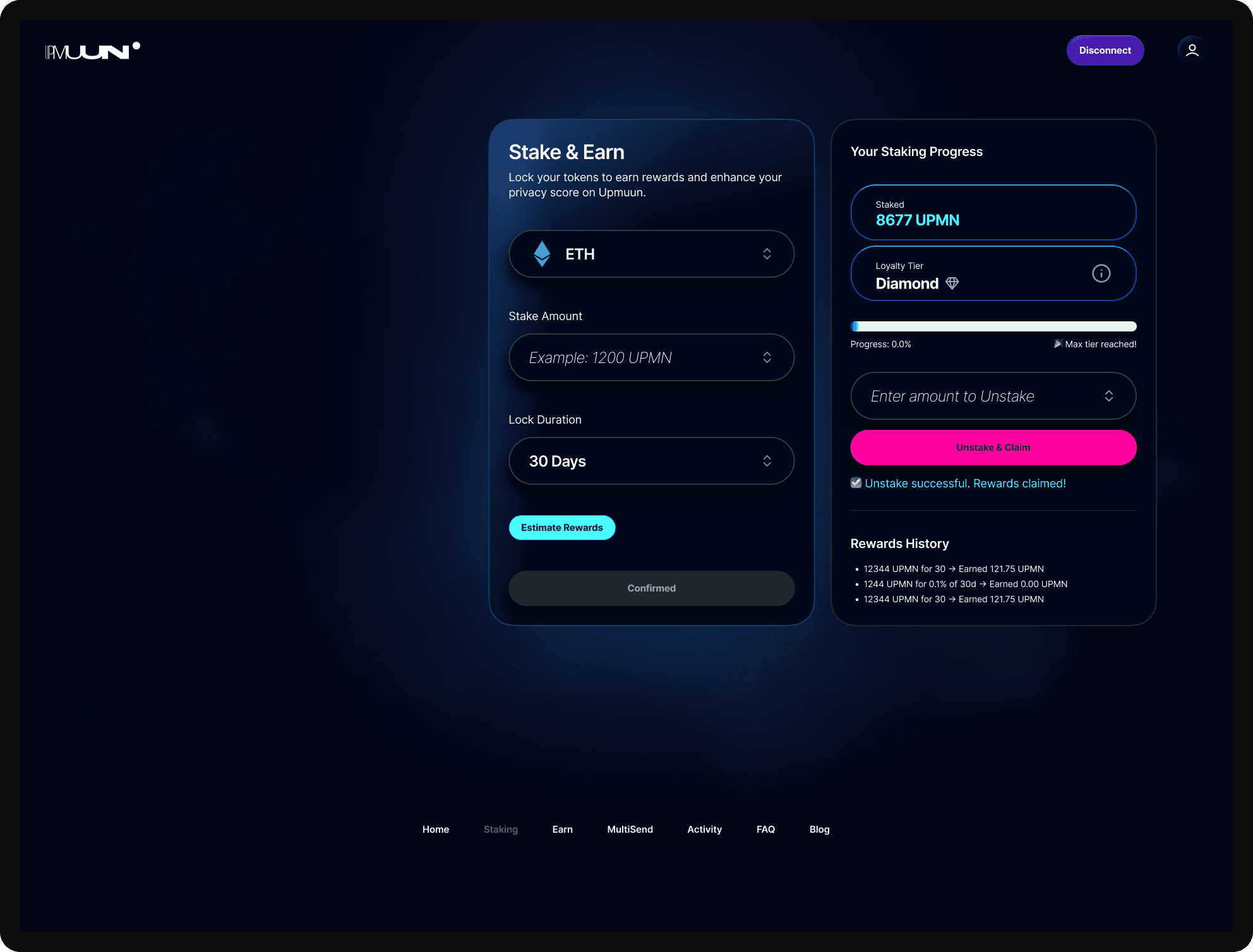Users can see stake duration, estimated rewards, and current tiers at a glance. Subtle animations highlight staking progress, and a vibrant pink accent marks reward actions like “ Unstake & Claim.” By blending clarity with small emotional touches, the design makes DeFi engagement approachable.
