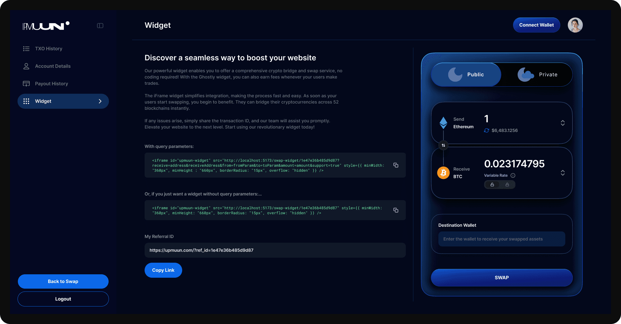 The widget mirrors the main swap interface, scales responsively, and can be embedded with or without query parameters. To simplify integration, I designed an instructional page with copy-to-clipboard snippets and setup visuals. The result is a lightweight, brand-consistent component that extends UpMuun’s ecosystem across the web.