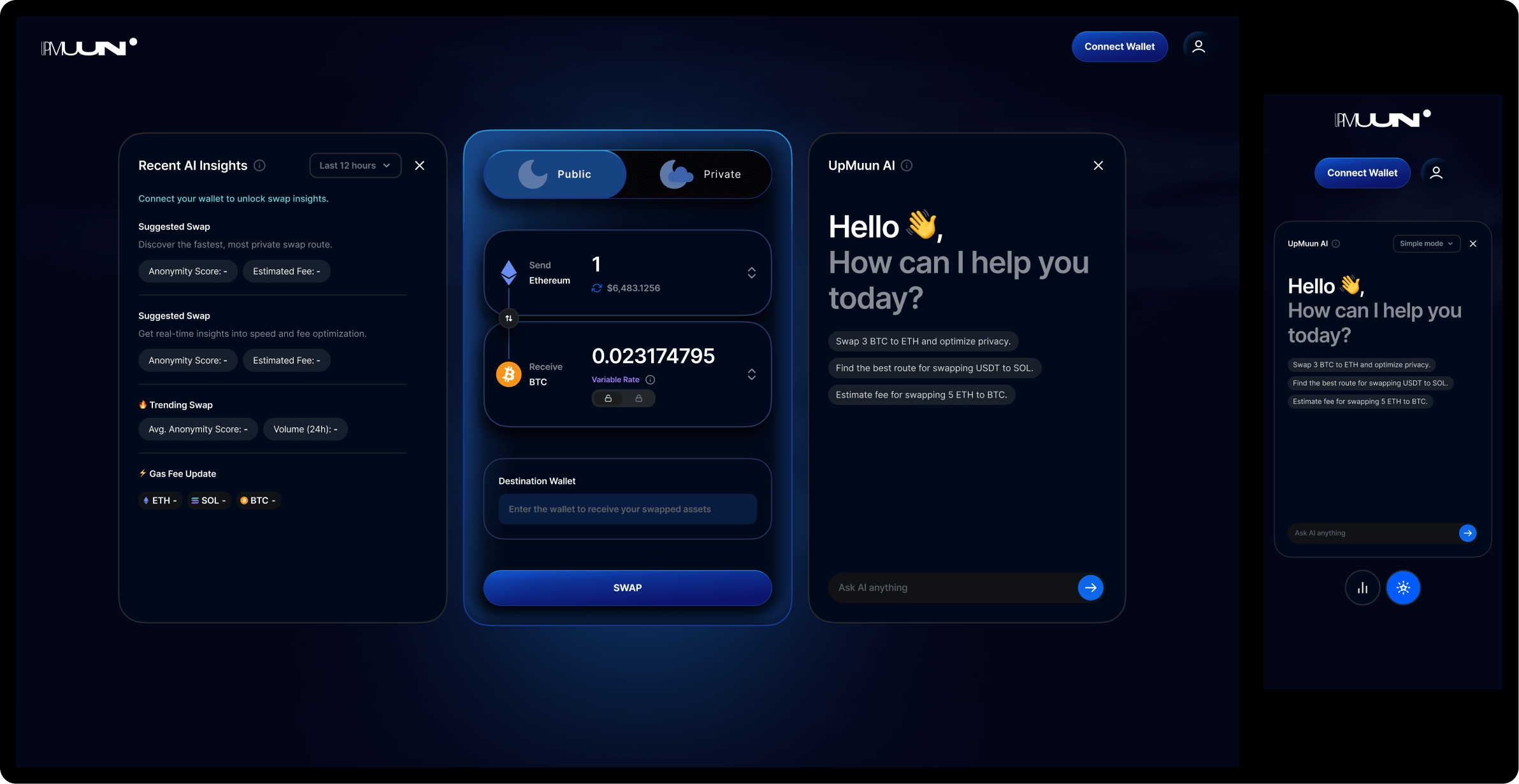 The platform was built to simplify one core interaction: swapping crypto assets anonymously. While most DeFi tools overwhelm users with settings, slippage controls, andtechnical data, UpMuun focuses on clarity and trust.