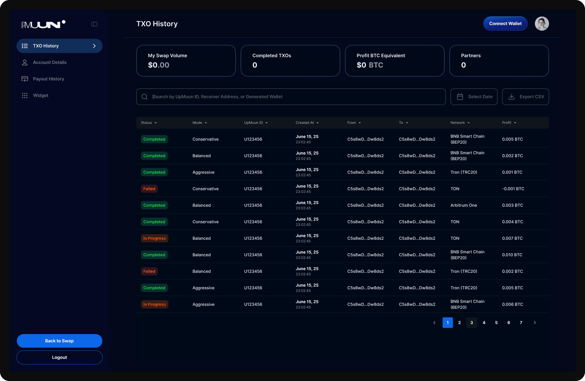 Users can review swap histories with filtering, status indicators, and detailed transaction data.