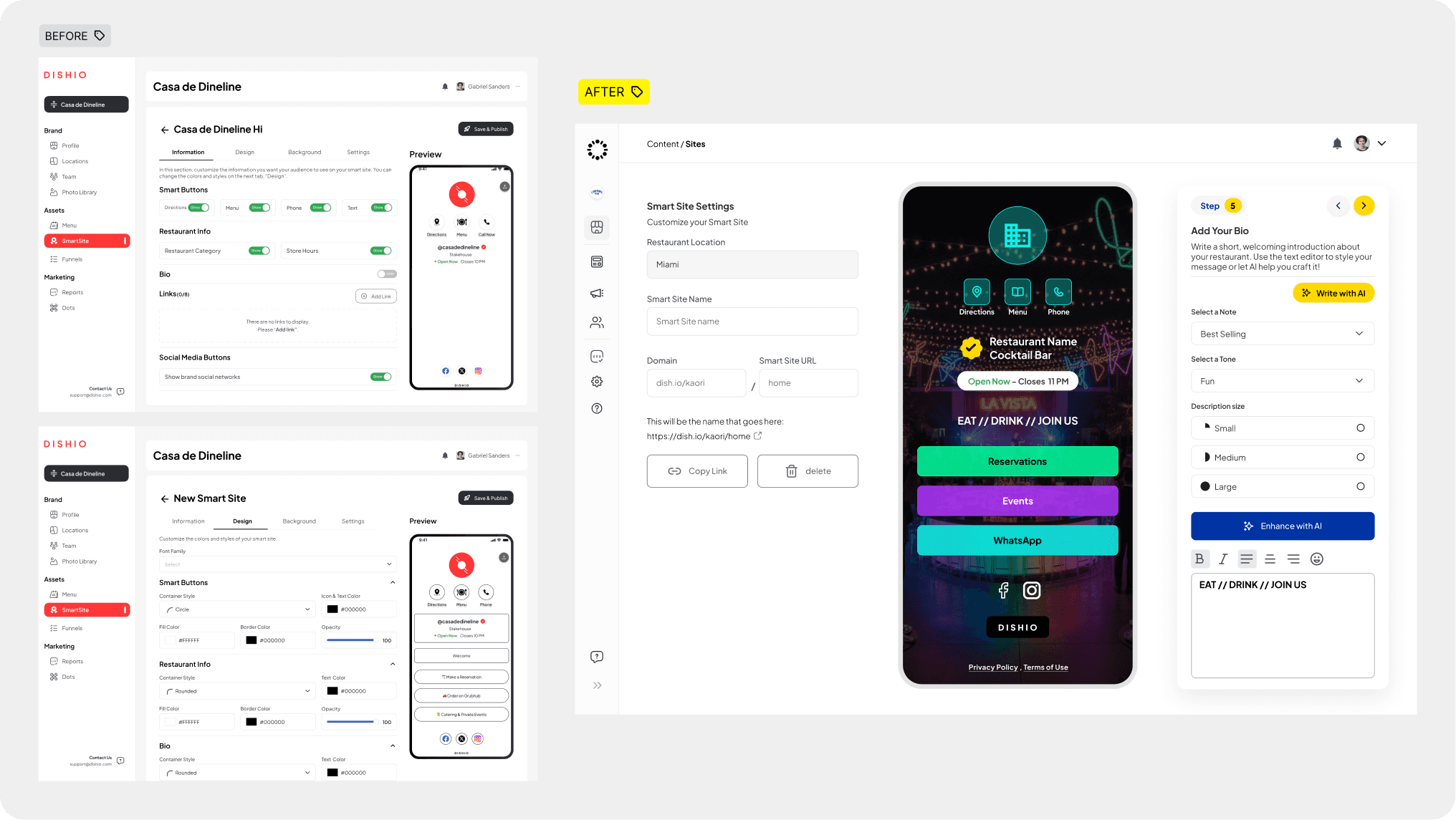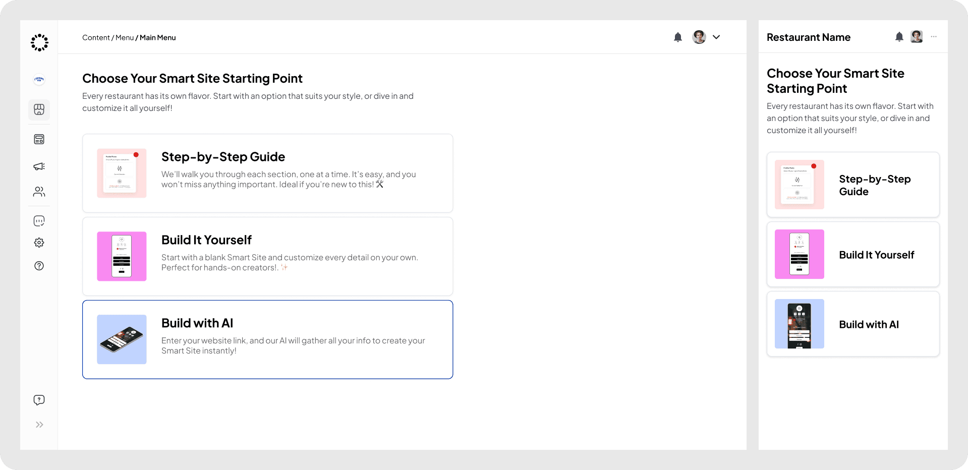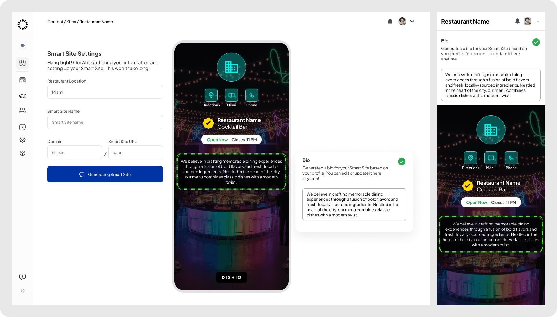 I introduced Build with AI, a feature that automatically generates complete restaurant sites. Users can paste their existing website text or menu, and the AI organizes it into structured sections, including menus, contact information, and business hours. The system then builds a full microsite with the correct layout, typography, and visual hierarchy.