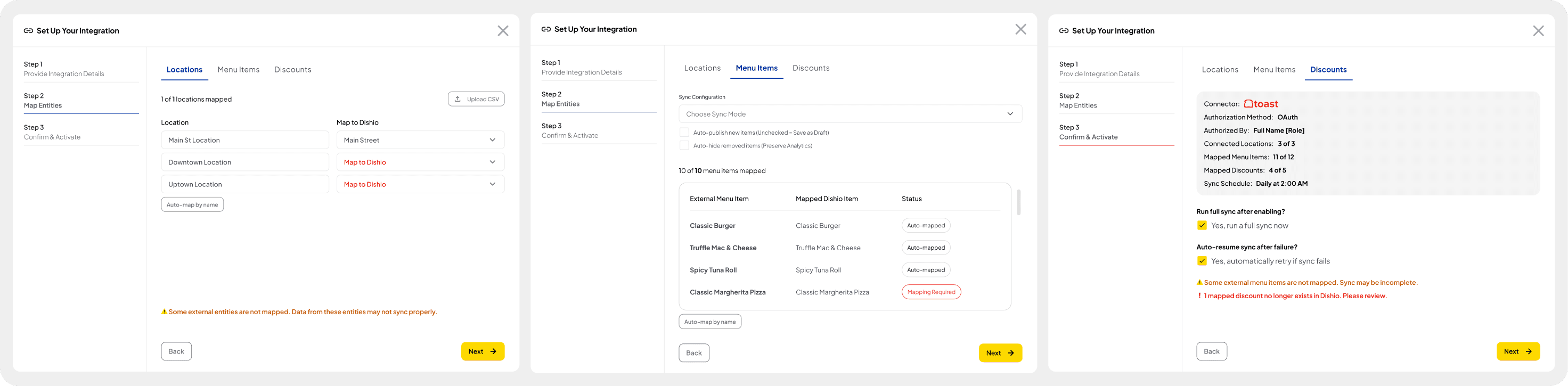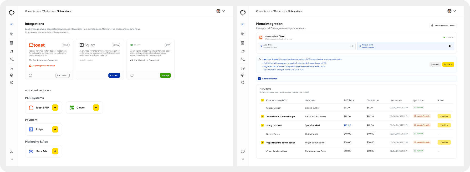 - Side-by-side comparison tables showing menu items, prices, and sync status between systems.