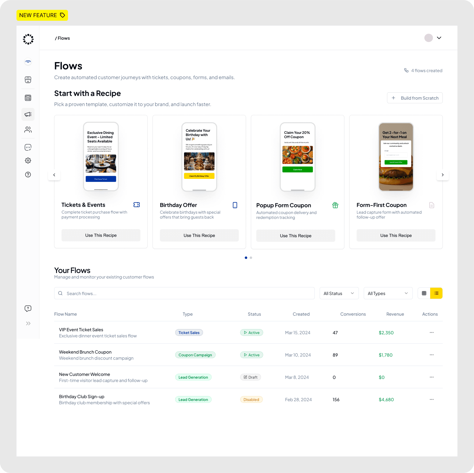 - Flow Recipes, pre-built templates for common campaigns that accelerate setup for new users.