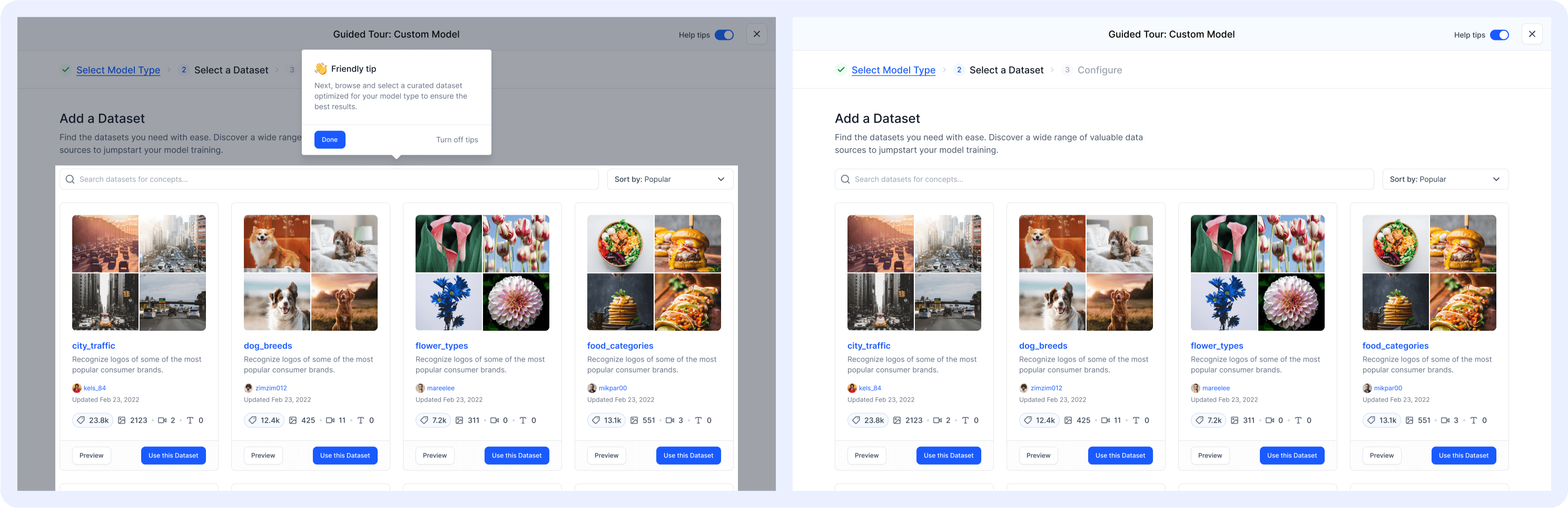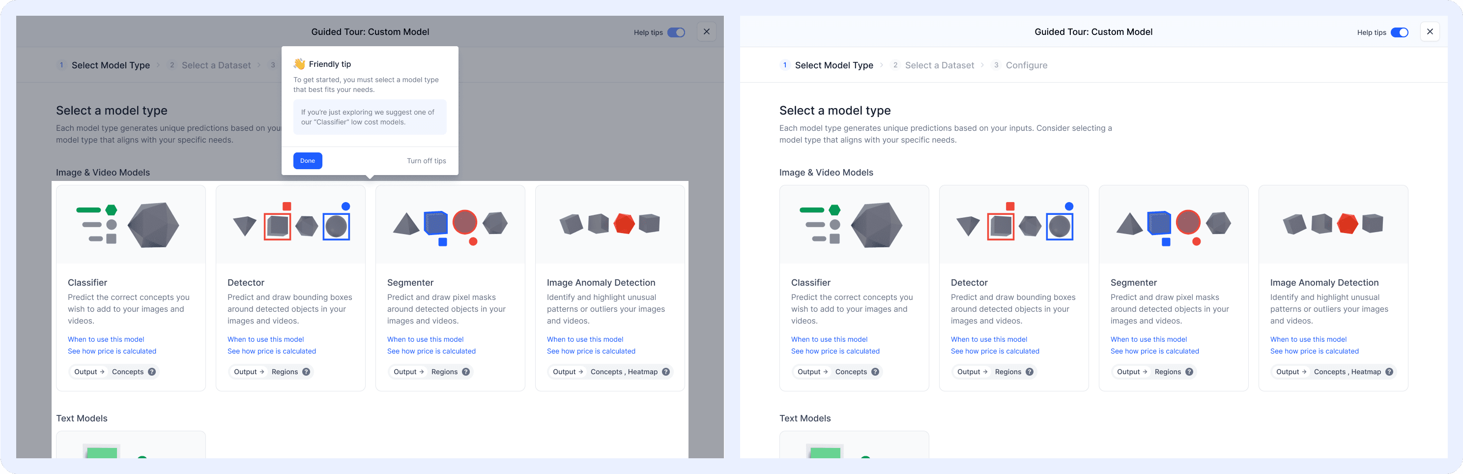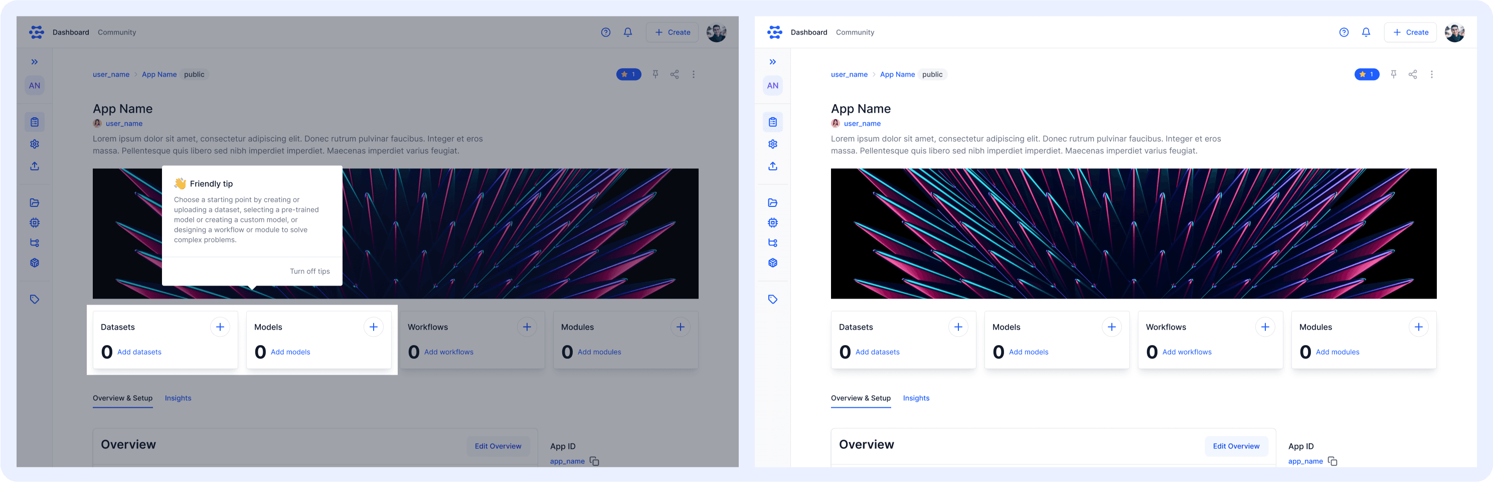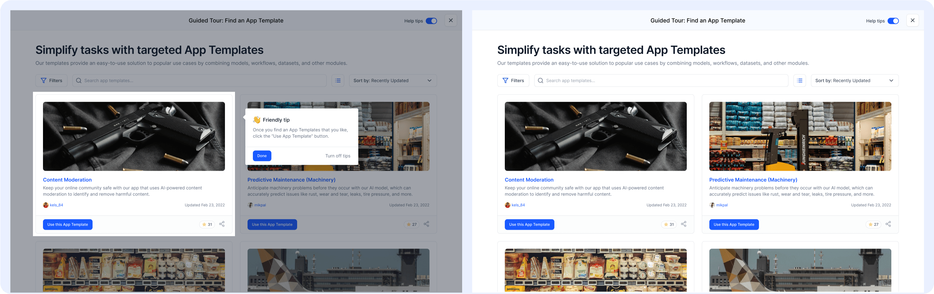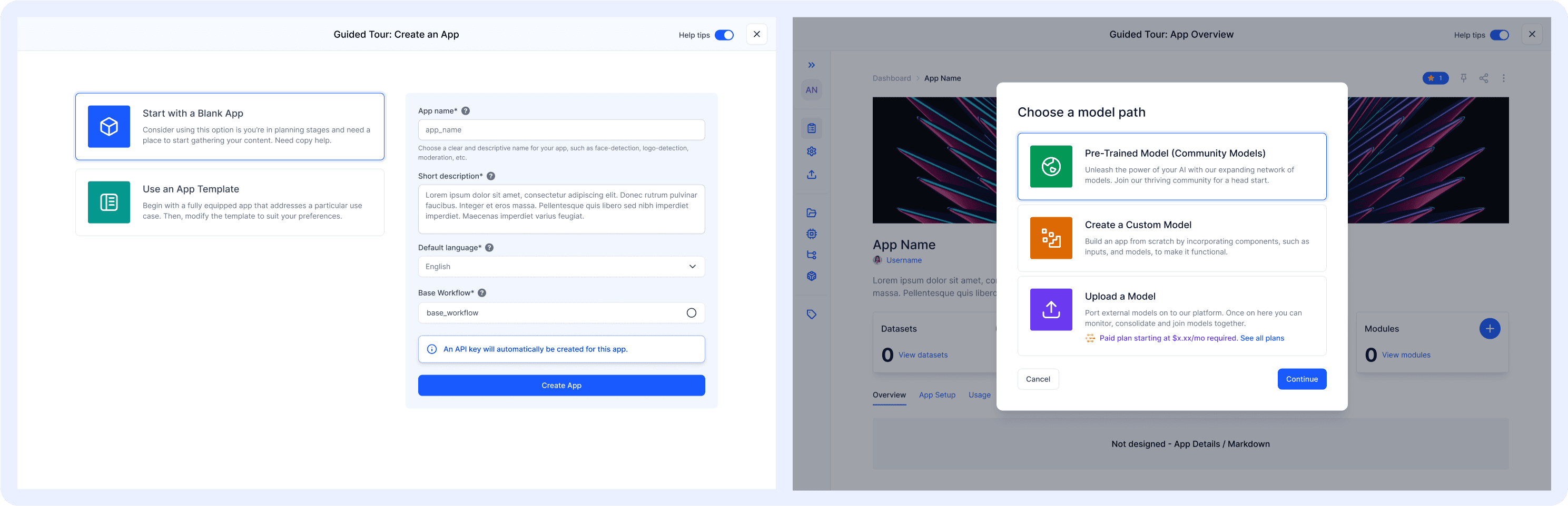- Guided Tours: Step-by-step flows for creating new apps and models.