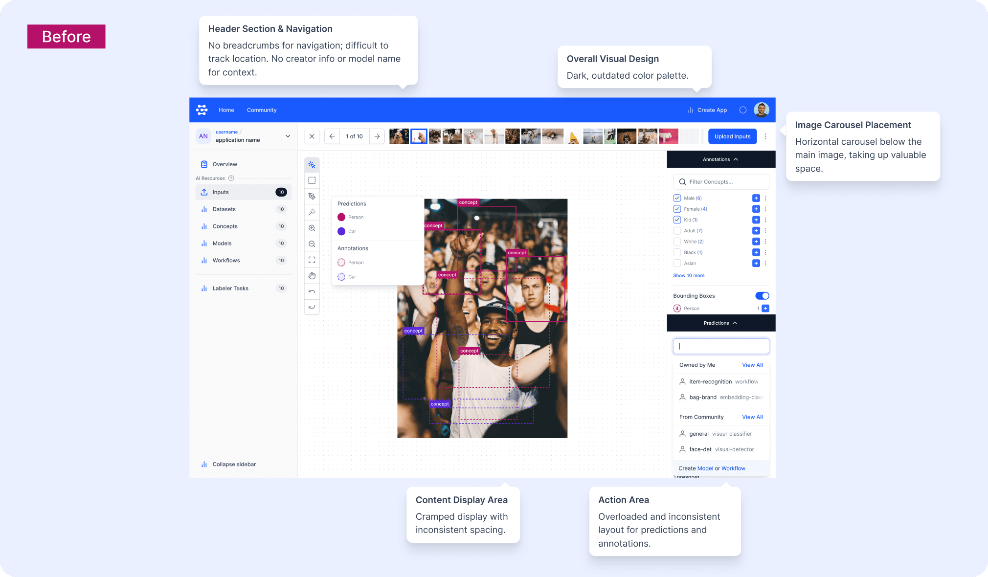 Clarifai’s previous interface was powerful but visually outdated and dense. The redesign introduced a lighter, more approachable aesthetic with clear hierarchies and simplified workflows.